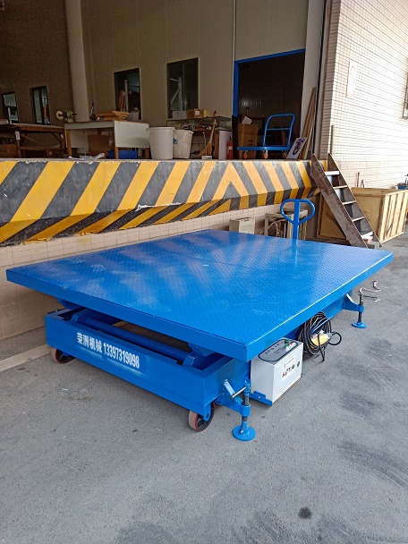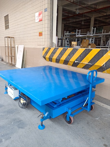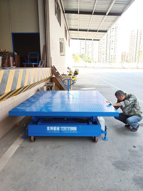 此款升降平臺(tái)帶車輪,移動(dòng)方便,可以在不同的地方使用,又帶支撐腿,承重的時(shí)候不會(huì)移動(dòng),負(fù)載大,使用安全。